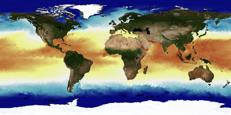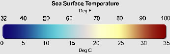 The picture below is a satellite generated image of sea surface temperature (SST) taken on June 22, 2011. Coral reefs are generally found in shallow, coastal waters that have temperatures ranging from 18-30°C. In these areas, the coral's symbiotic algae can still receive light.