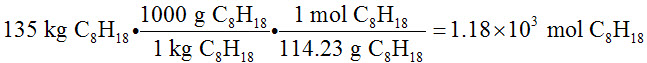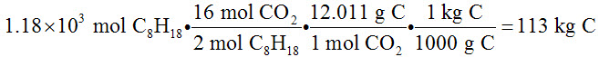 Now we can calculate kg of carbon released into the atmosphere using the moles of C8H18 we calculated previously: